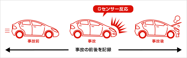 Gセンサーで衝撃を検知すると、衝撃前後の映像を上書きされないように専用フォルダに記録します。