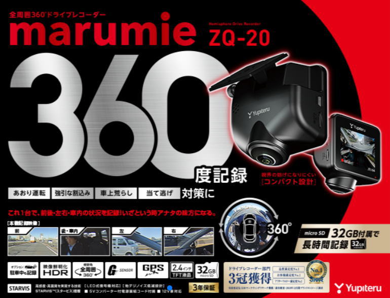 新商品:指定店専用モデル ドライブレコーダー marumie「ZQ-20」全周囲360°を記録できるドライブレコーダー